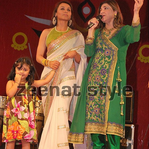 Rani was as usual spotted in Saree trends. But here she's wearing very stylish outfit with closed halter neck green blouse haivng beaded lace on it, while the pallu is finished with gota lace on it in green-golden shades.